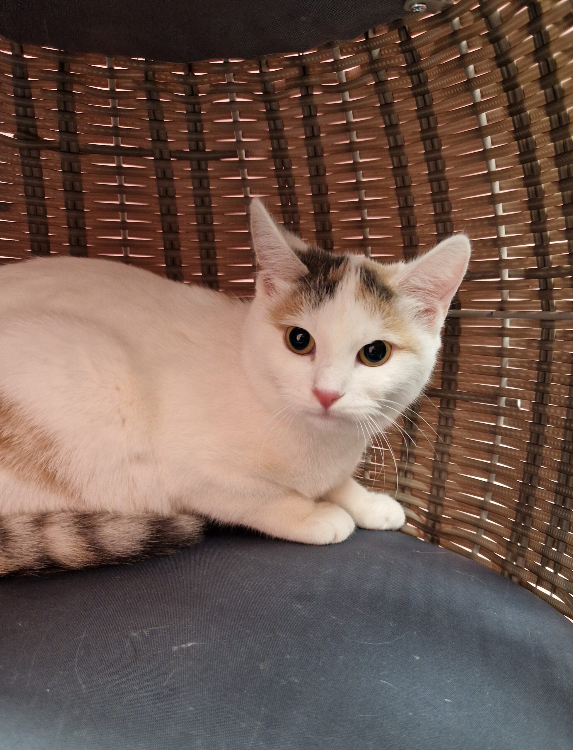Peach wurde zusammen mit ihren Geschwistern gefunden. Peach ist noch sehr zurückhaltend gegenüber Menschen, mit viel Geduld lässt sie sich mit einer Spielangel aus ihrer Höhle locken. Peach hat sich bei uns einen Schnupfen eingefangen, der trotz Behandlung nicht ganz ausgeheilt ist. Es könnte sein, dass der Schnupfen im neuen Zuhause besser wird oder sogar ganz ausheilt. Peach ist ca 5 Monate alt, geimpft, gechipt und entwurmt. Nach der Kastration und einer Eingewöhnungszeit braucht sie eine Freigangmöglichkeit. Wer hat ein Plätzchen frei?